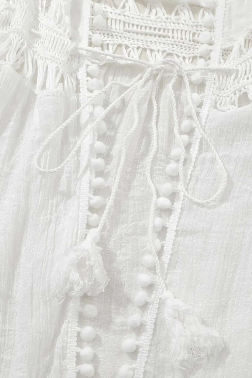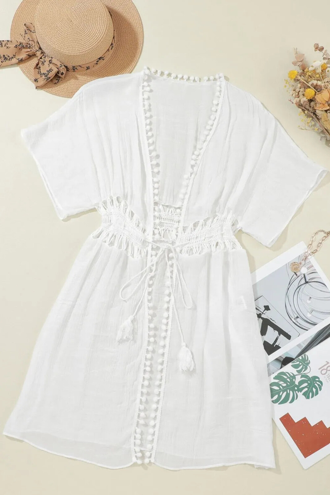Ready to channel a bit of vintage bohemia in your beachside wanderings? This cover-up is the sort of piece you’d spot poolside at some dreamy Grecian villa, and then spend ages trying to find out where it’s from - only to realise all your chicest mates have quietly nabbed one already. It’s a breezy, semi-sheer dream with delicate crinkled gauze that flirts with the sea breeze. Add an open v-neck, a line of hand-crafted pom-poms, and the sort of tasselled tie you just want to twirl absentmindedly while waiting for your Aperol spritz.