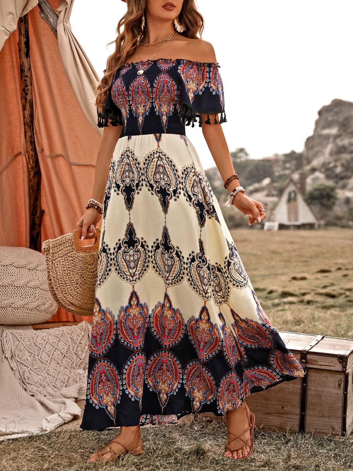 Step into whimsical wonder with the Gypsy Spell dress - a bohemian dream spun with multicoloured paisley magic. This maxi marvel features an off-shoulder neckline that flirts with the breeze and a shirred bodice that hugs like a happy memory. Those short sleeves? They’re adorned with ruffle trim, adding a cheeky texture contrast to the wide, flowing skirt that dances with every step.