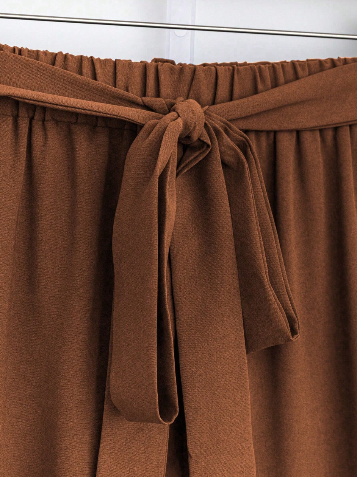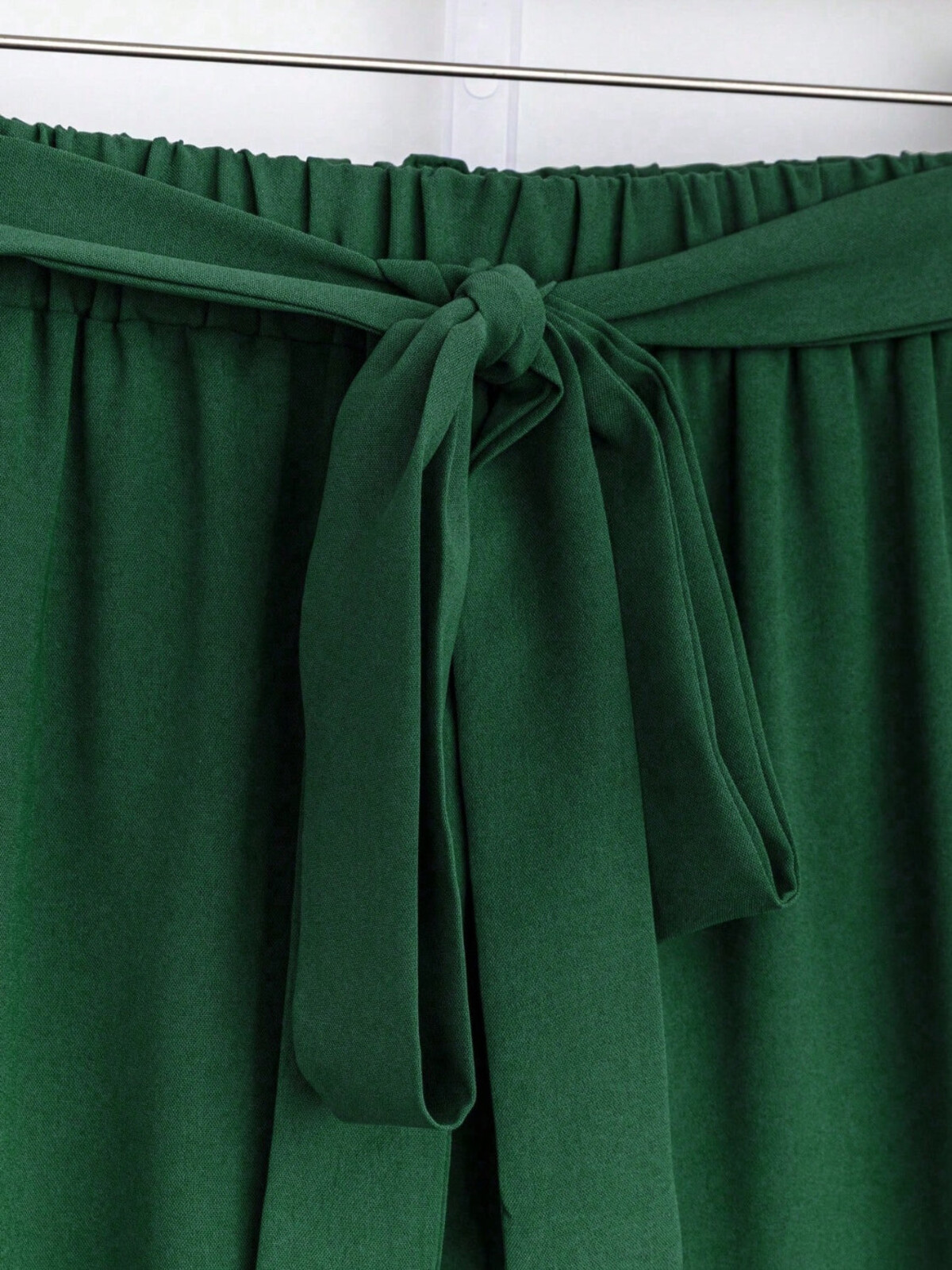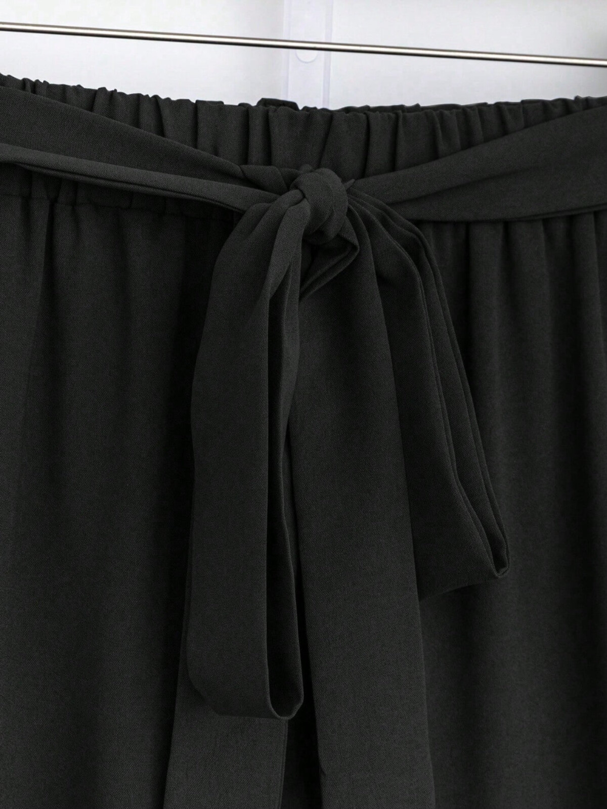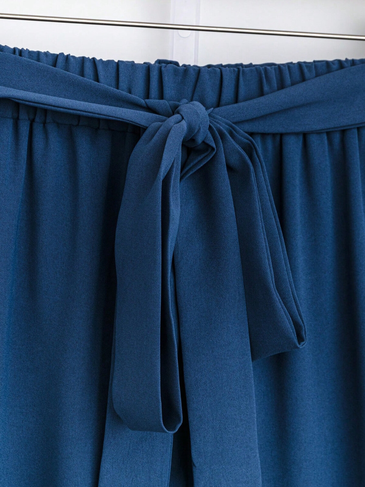 These wide leg trousers have a modern self-tie bow detail and look great with a blouse or a tank top.
