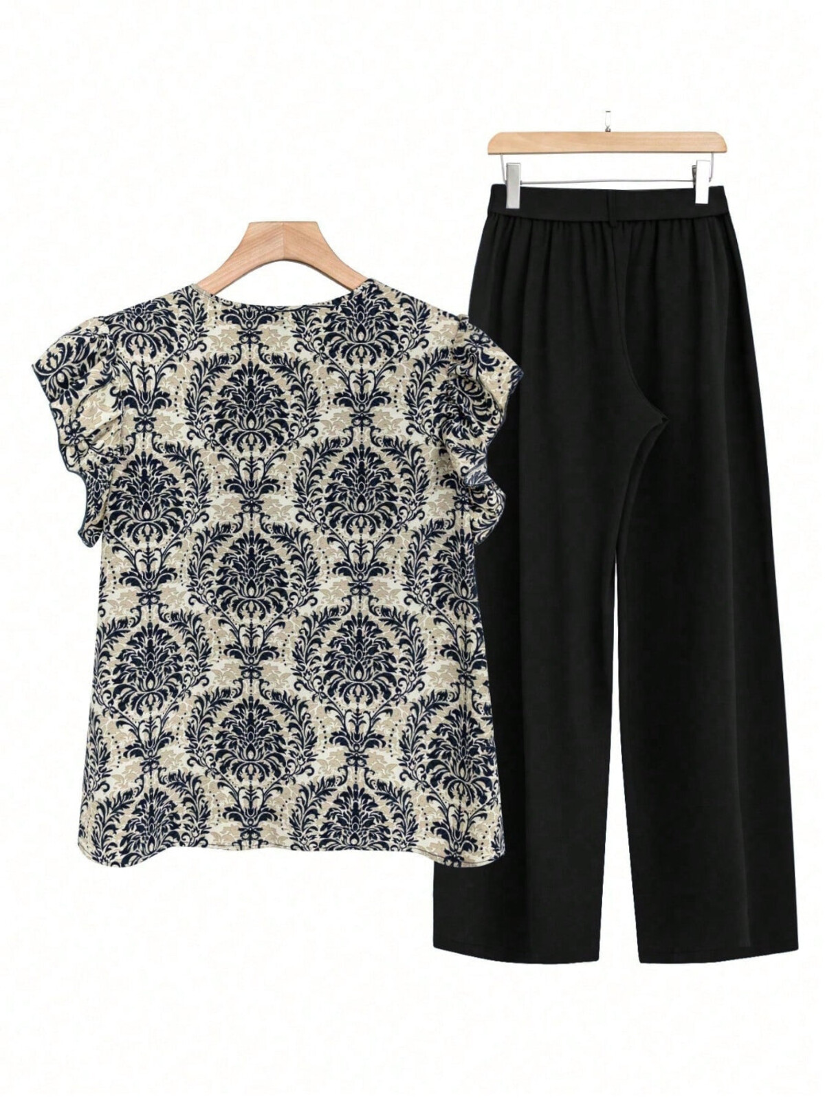 And while there are no bells and whistles, there are dramatic flutter ruffle sleeves that make gesturing wildly at brunch far more exciting. The neckline is finished with neat facing and topstitching, and the materials are 95% polyester and 5% elastane - giving it structure without feeling like cardboard. It’s lightweight and will help keep the sweat off, but isn’t so sheer that you’ll need to double up on undergarments (always a plus). And with a chic damask print on the top and colour-coordinated solid trousers, this set is all about being understated, practical and pretty all at once.
