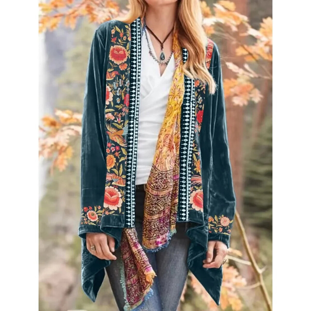 The velvet wrap that's been causing a stir in the city is this ornate, plush, and visually eclectic outer layer - it's boho, it's vintage, and it's everything you'd want when you're feeling particularly indulgent. There's something about its plushness that just feels extra luxe - the kind you want to linger in on cool evenings while looking like an absolute legend. The open front is entirely inviting and the asymmetrical hem flows beautifully, even as you're strutting down the road or running for a ride.