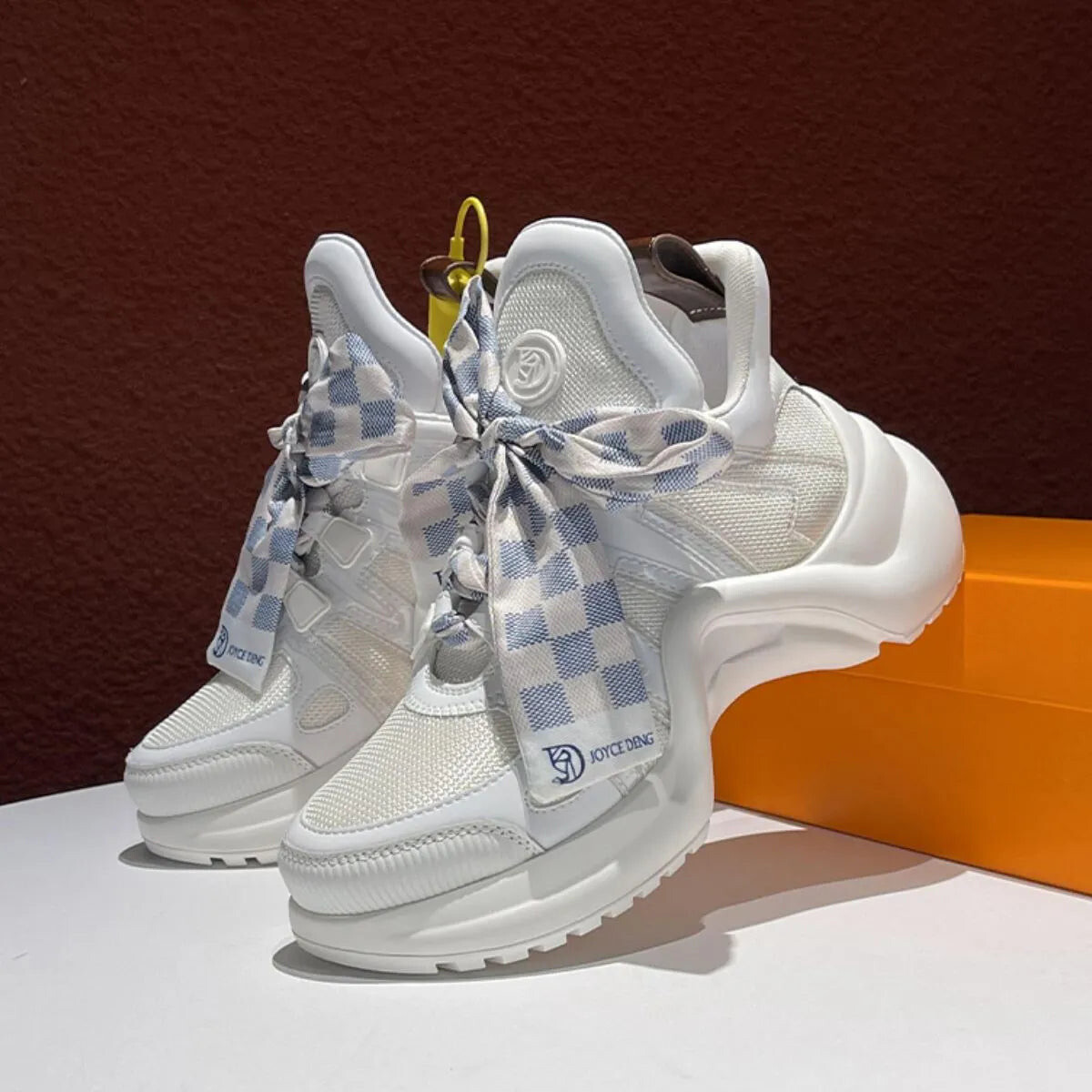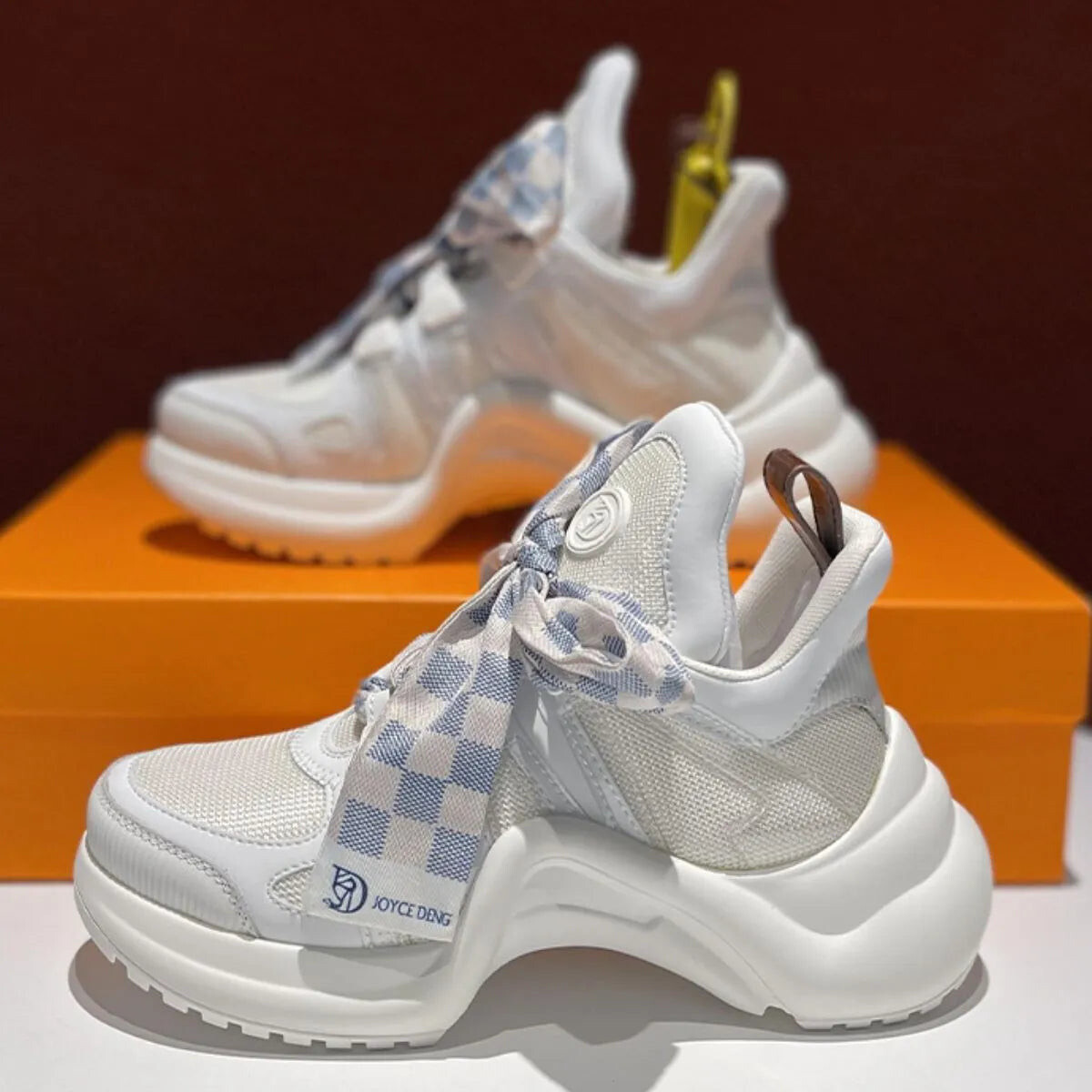Now for the fun part - the extra-wide checkerboard lacing system that spells DRA-MA. Available in two versions - blue-and-white and copper squares with "J.Y.C." branding - both editions are beautiful in their own way and are oversized for an exaggerated effect. The sole design is another fashion-forward element of these trainers, which features a foam heel finished in white and black arch detailing.