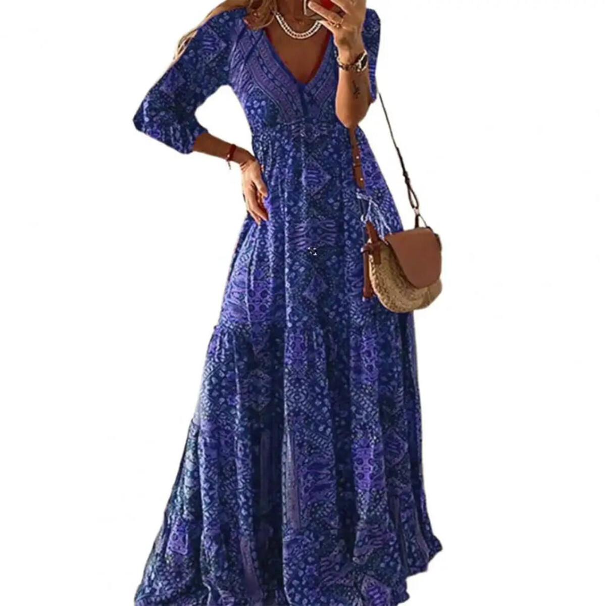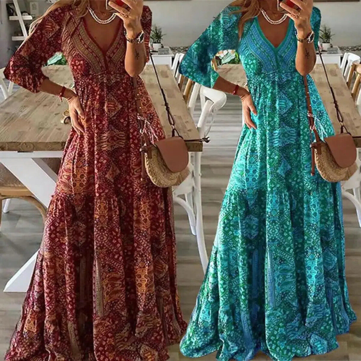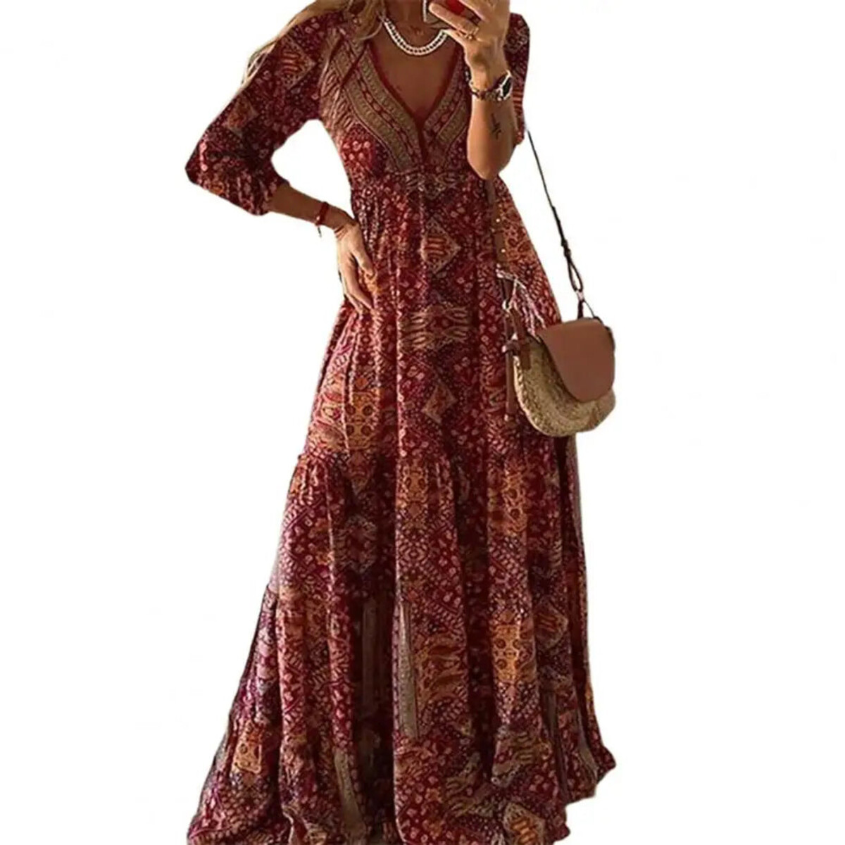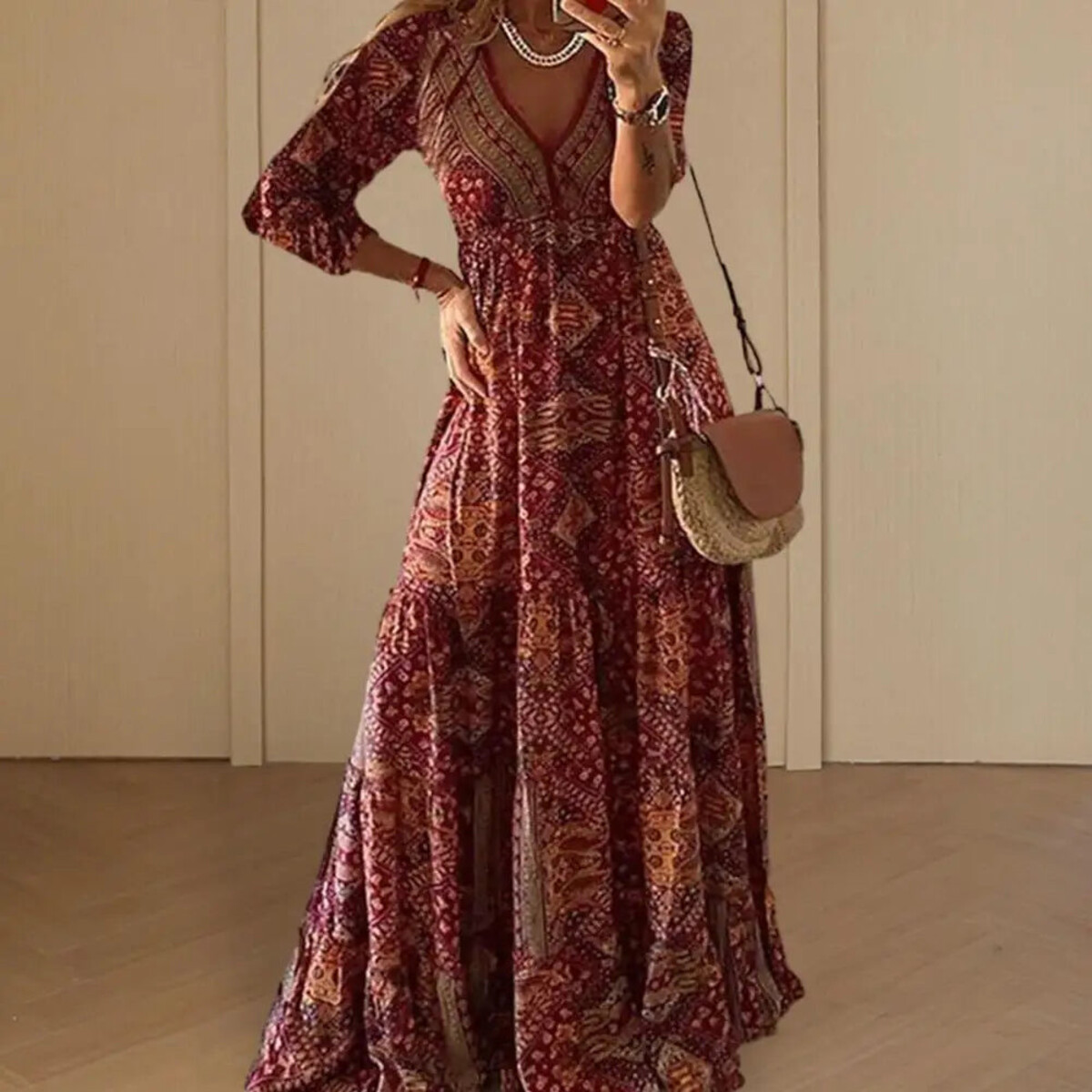 There’s something about a boho maxi dress that makes one think of witty, sun-drenched summer get-togethers. But this – this is the real thing. It’s ethereal and dreamy with long swathes of flowing polyester fabric, and it’s got those mosaic prints that remind you of retro sun-kissed streets and nonchalant touristy holidays. And while it brings all this to your mind, the Mystic Mosaic vintage bohemian dress manages to be comfy and easy, with three-quarter sleeves and an ankle-skimming length. The V-shaped neckline shows off your collarbones, while a gathered empire waist makes for an easy pullover fit that flatters every silhouette. And the pièce de résistance: the voluminous skirt falls in artful folds with tiered stitching for extra movement. The best part? This dress can go from casual brunch to midnight soiree in seconds! It’s versatile, fuss-free, and always ready to make you feel beautiful - while making a statement that says ‘fashionable’ in every language possible!
