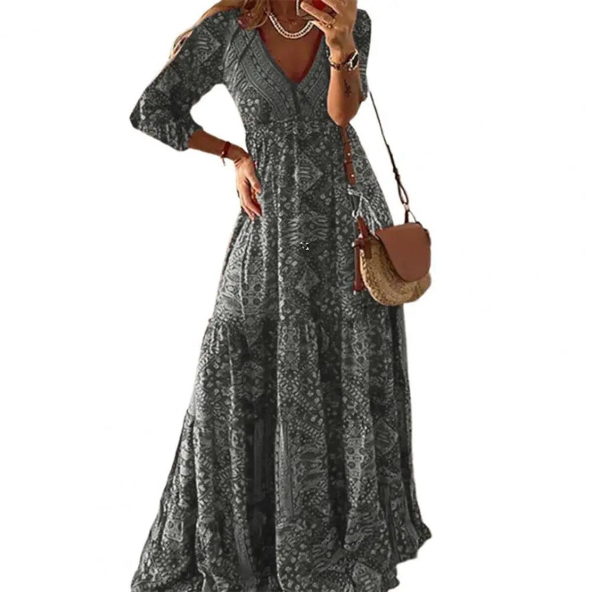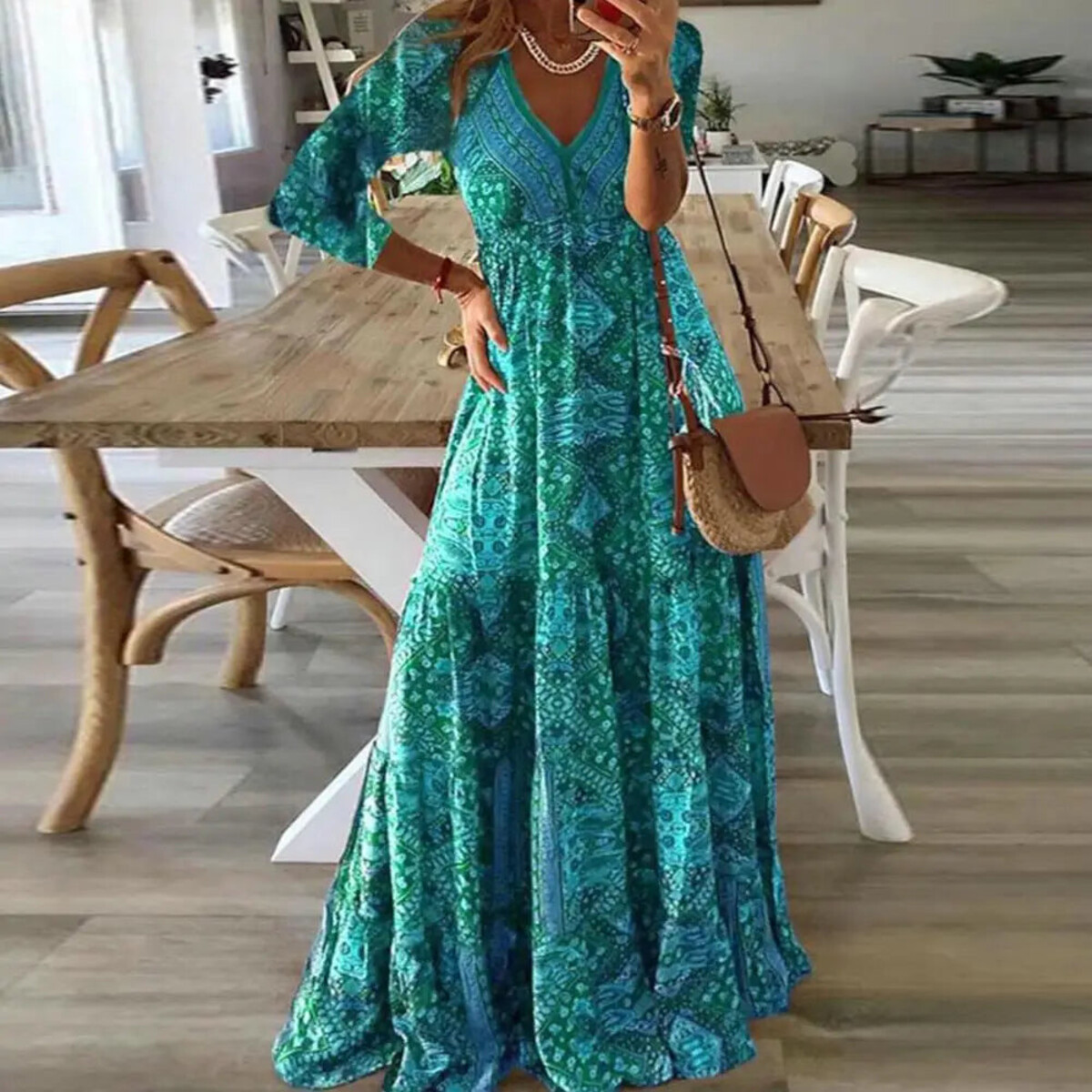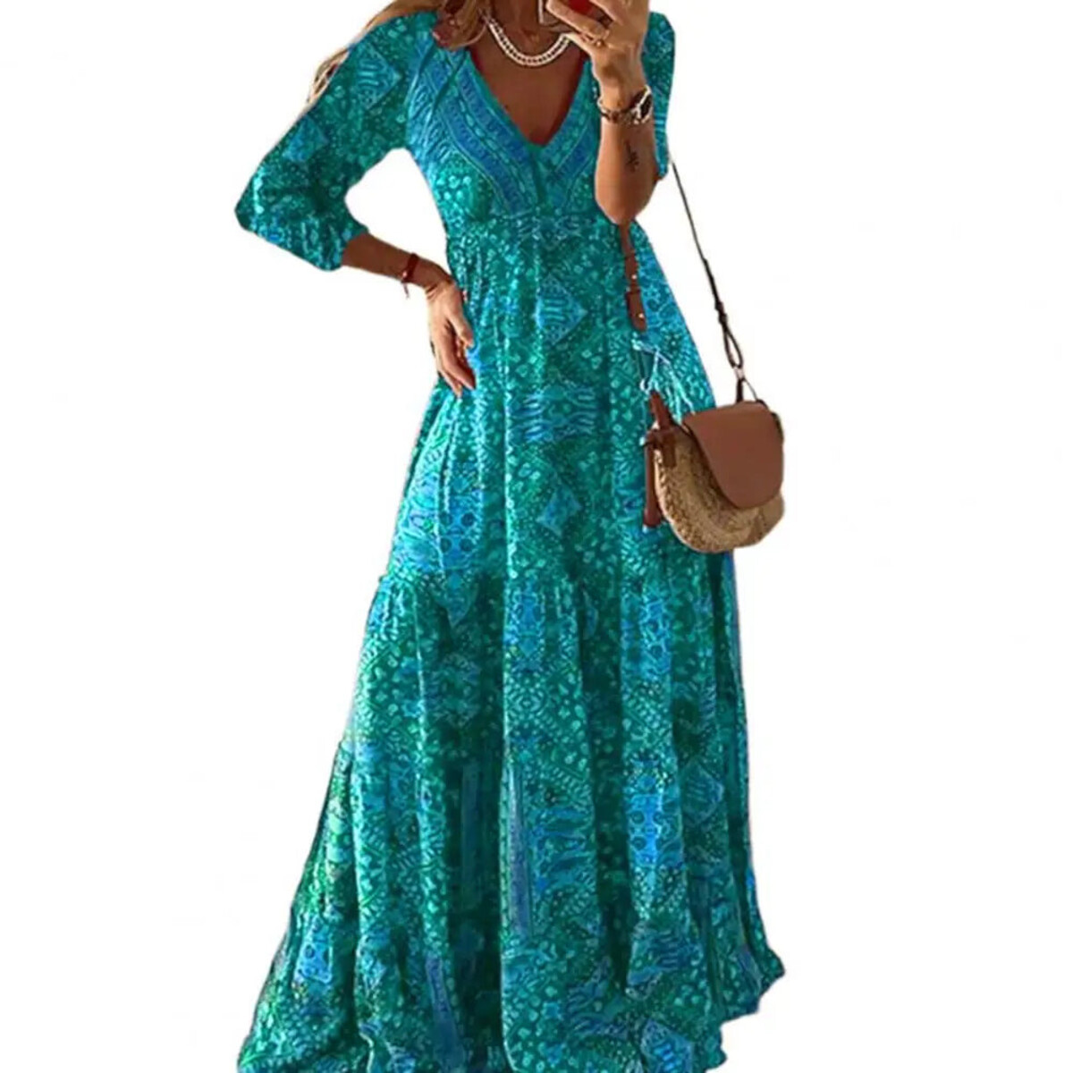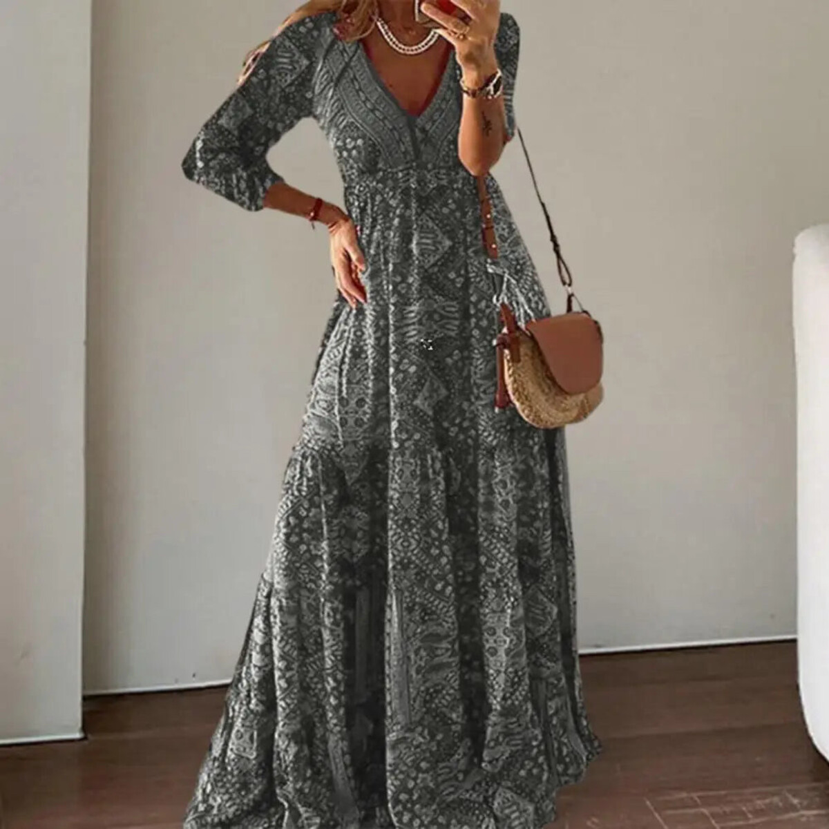 There’s something about a boho maxi dress that makes one think of witty, sun-drenched summer get-togethers. But this – this is the real thing. It’s ethereal and dreamy with long swathes of flowing polyester fabric, and it’s got those mosaic prints that remind you of retro sun-kissed streets and nonchalant touristy holidays. And while it brings all this to your mind, the Mystic Mosaic vintage bohemian dress manages to be comfy and easy, with three-quarter sleeves and an ankle-skimming length. The V-shaped neckline shows off your collarbones, while a gathered empire waist makes for an easy pullover fit that flatters every silhouette. And the pièce de résistance: the voluminous skirt falls in artful folds with tiered stitching for extra movement. The best part? This dress can go from casual brunch to midnight soiree in seconds! It’s versatile, fuss-free, and always ready to make you feel beautiful - while making a statement that says ‘fashionable’ in every language possible!