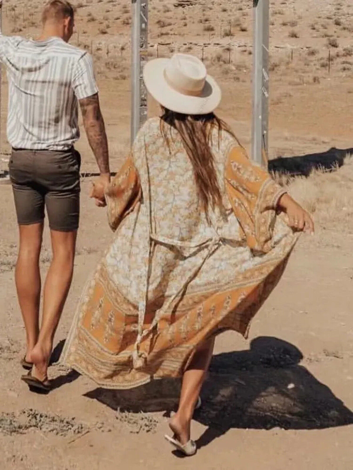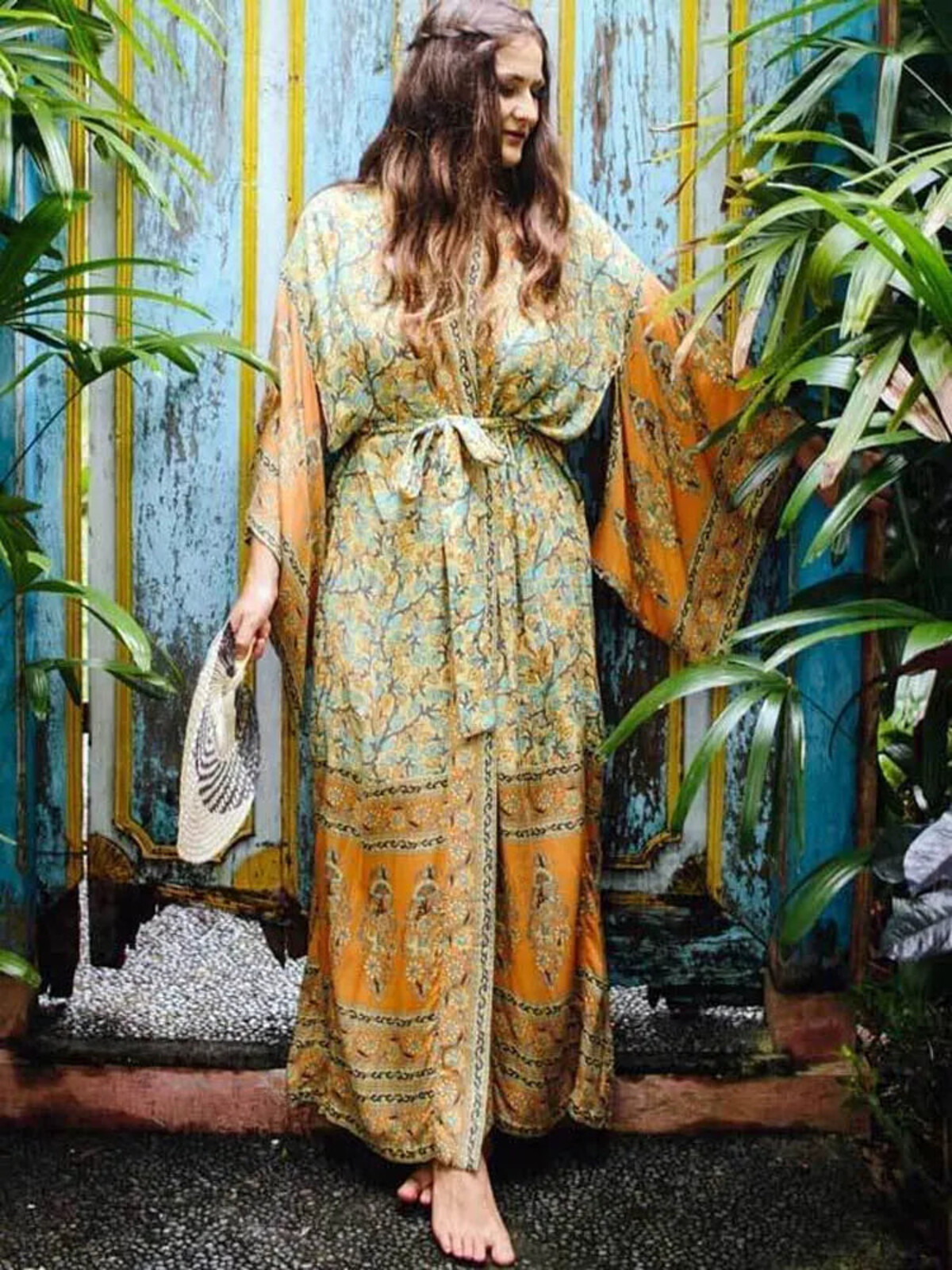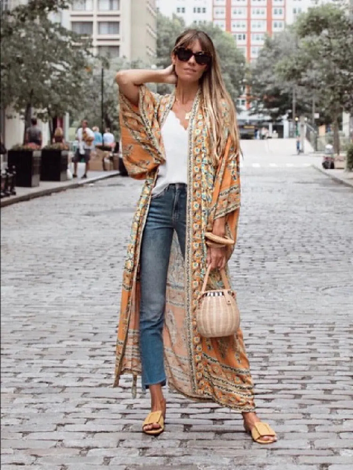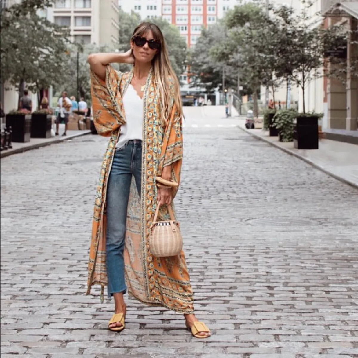 There’s little more liberating than the billow of a well-cut kimono - it’s essentially socially-acceptable pyjamas for grown-ups. But with a twist, of course. This isn’t your average cotton housecoat that’s seen the washing line one too many times. No, this kimono is all about high-end lounge chic - a piece that knows its way round a Friday night dinner and a Saturday morning coffee date equally. It’s floaty, and fabulously lightweight so it’ll easily slip over shorts and swimmers for a touch of beachside glam but can absolutely be worn to the shops without causing a stir. The print is intricate and easy-to-wear, but not at all overwhelming. It’s a clever combination of bohemian shapes and fun repeating patterns that makes this kimono feel as at home by the ocean as it does in the city. And while it feels both luxe and comfortable, it doesn’t have to be styled up with barely-there heels or glittering accessories. Just throw on some leather mules and you’re good to go!