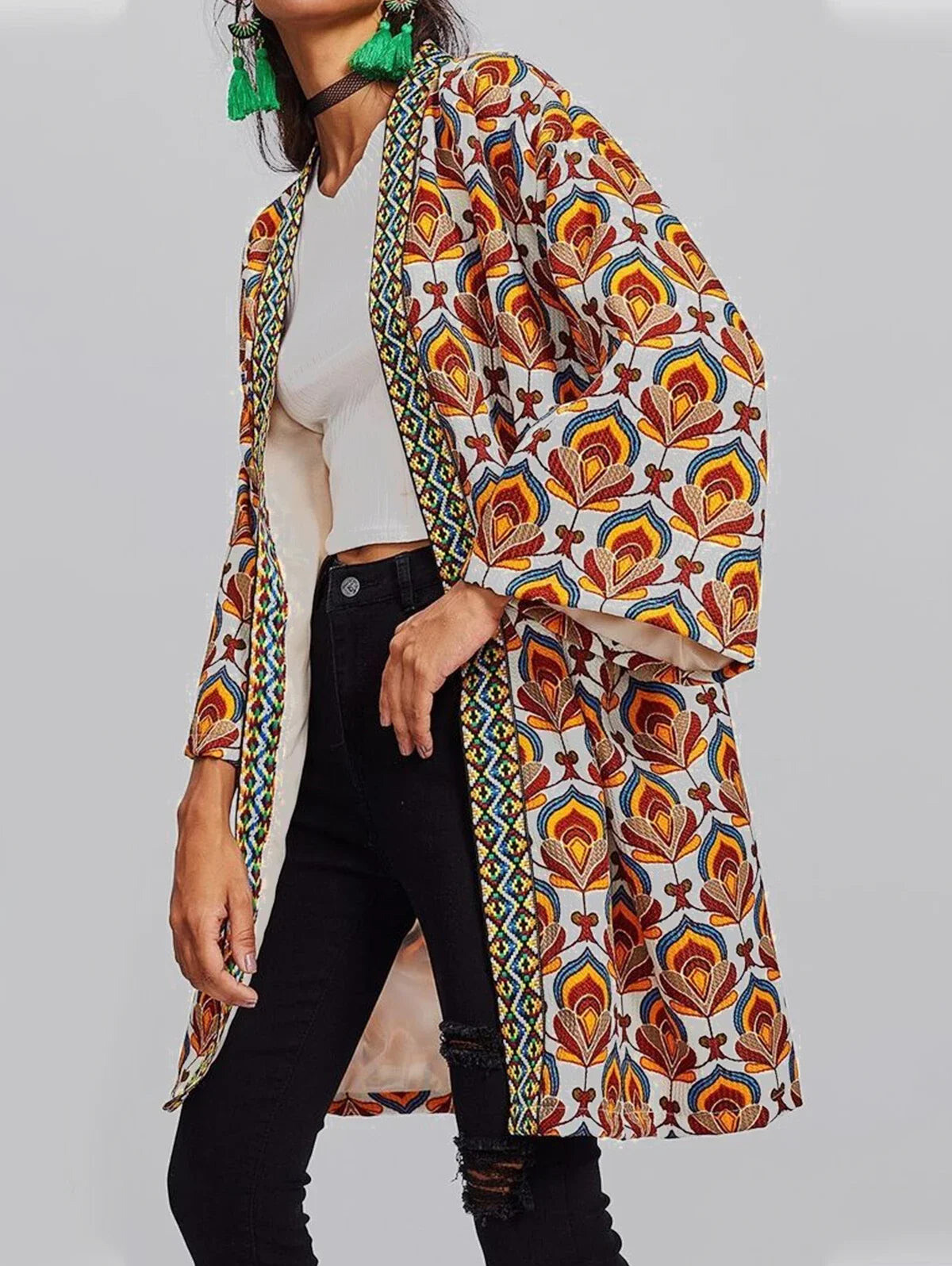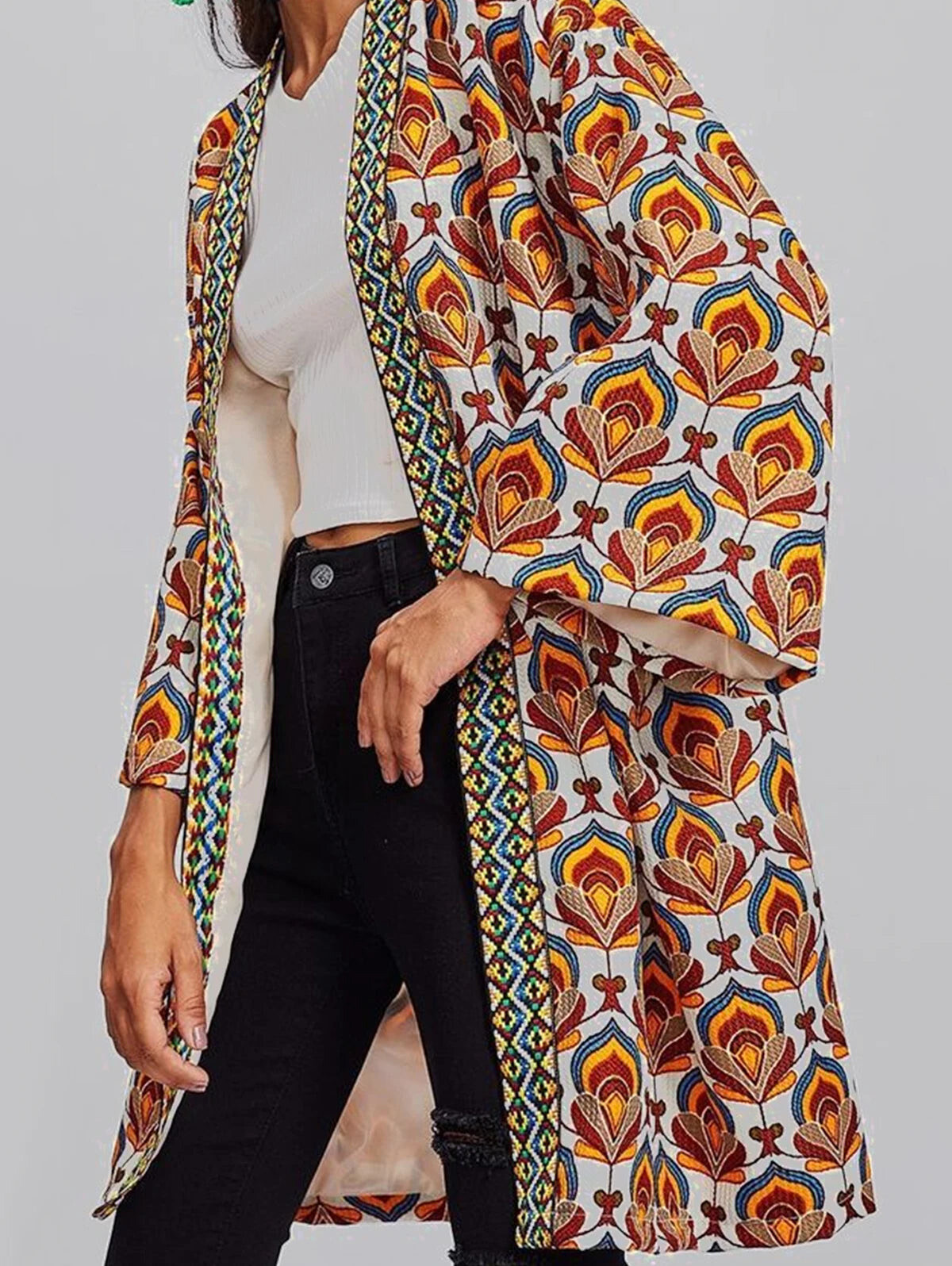 The drama, the flair, the print - this kimono’s practically begging for a life with meaning. It’s got that fantastically bold heritage-inspired design, with an open front that doesn’t shy away from showing off your best bits underneath (a little mystery, a lot of personality). Full sleeves? Tick. And there’s even a show-stopping geometric trim running top to bottom for good measure. Honestly - and this comes from years clocking up late nights at gallery openings and charity auctions - this is what you throw over your shoulders when you want to be memorable in a room.